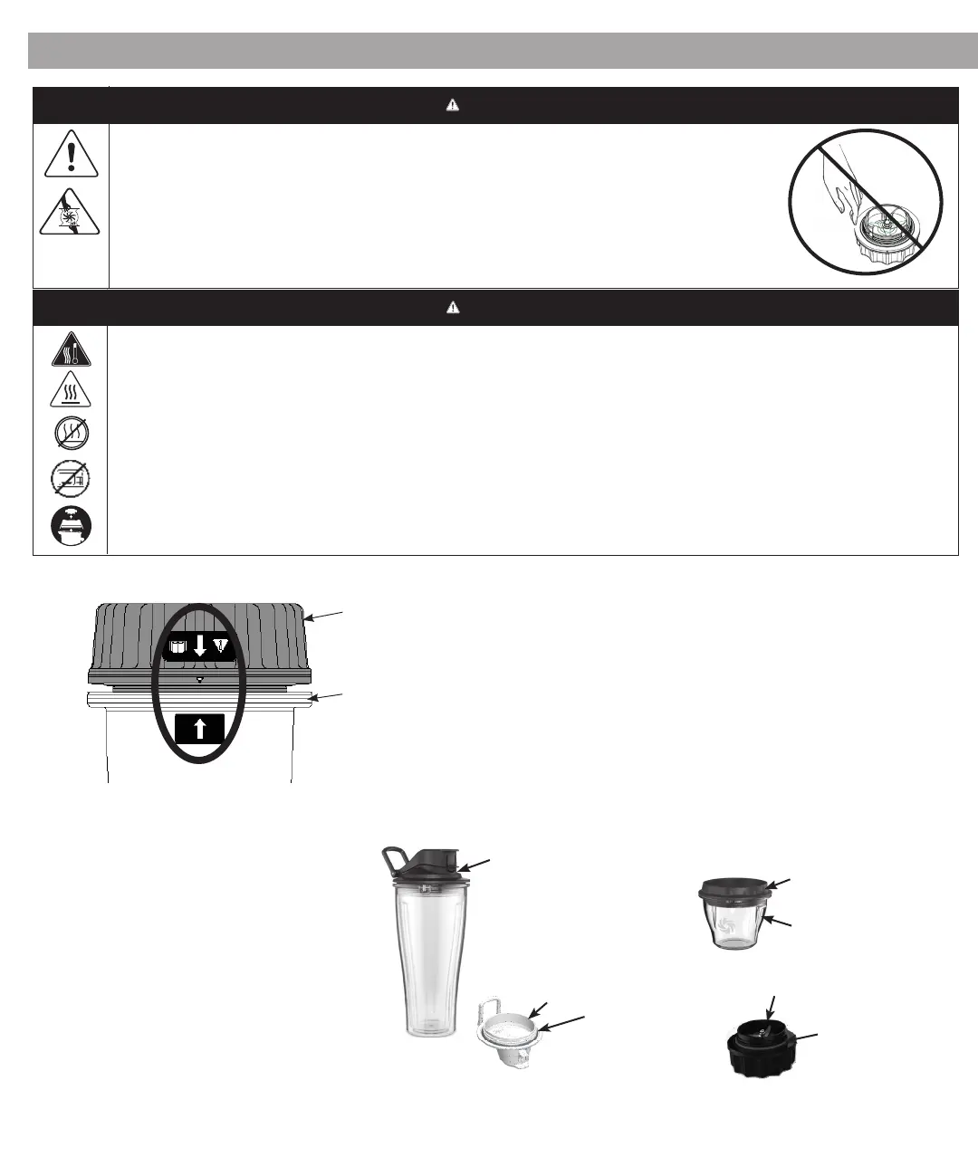 Tighten the blade base onto the bowl or cup until the arrows line up with the arrow on the bowl or cup.