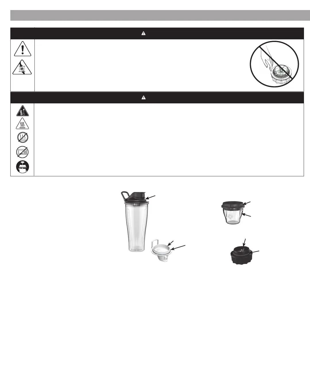 To avoid damage or personal injury, DO NOT use the cups (including the blade base or lids) in the microwave.
