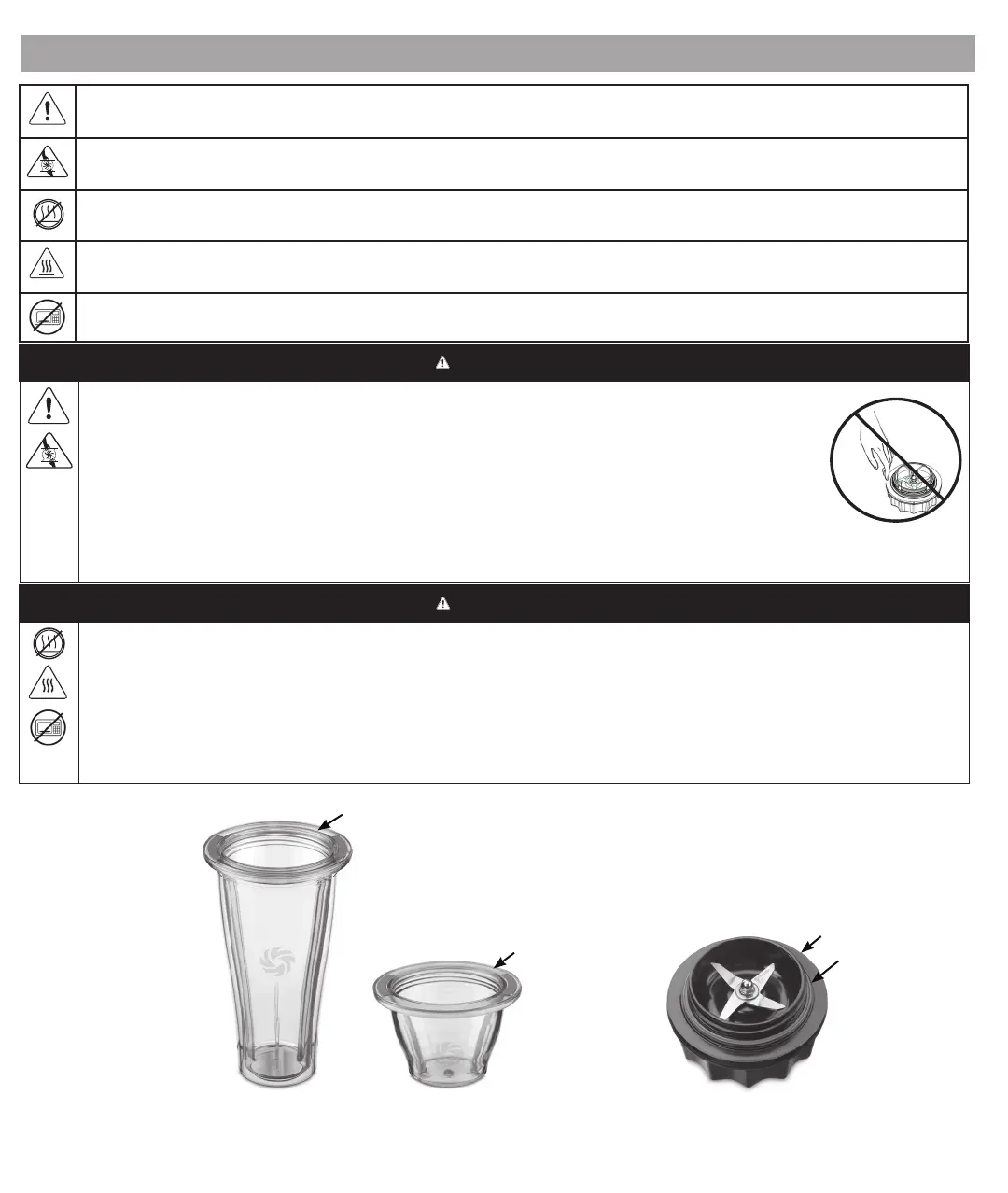 Pour éviter les dommages ou les blessures corporelles, ne PAS utiliser les tasses (y compris la base de lames ou les couvercles) dans le