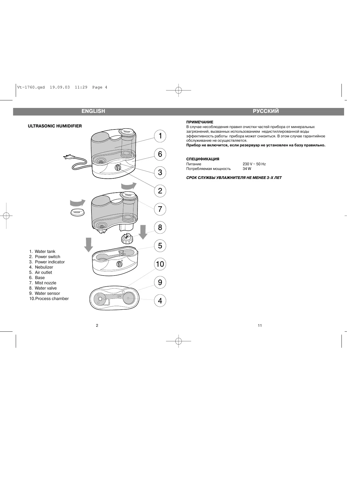 СРОК СЛУЖБЫ УВЛАЖНИТЕЛЯ НЕ МЕНЕЕ 3Х ЛЕТ