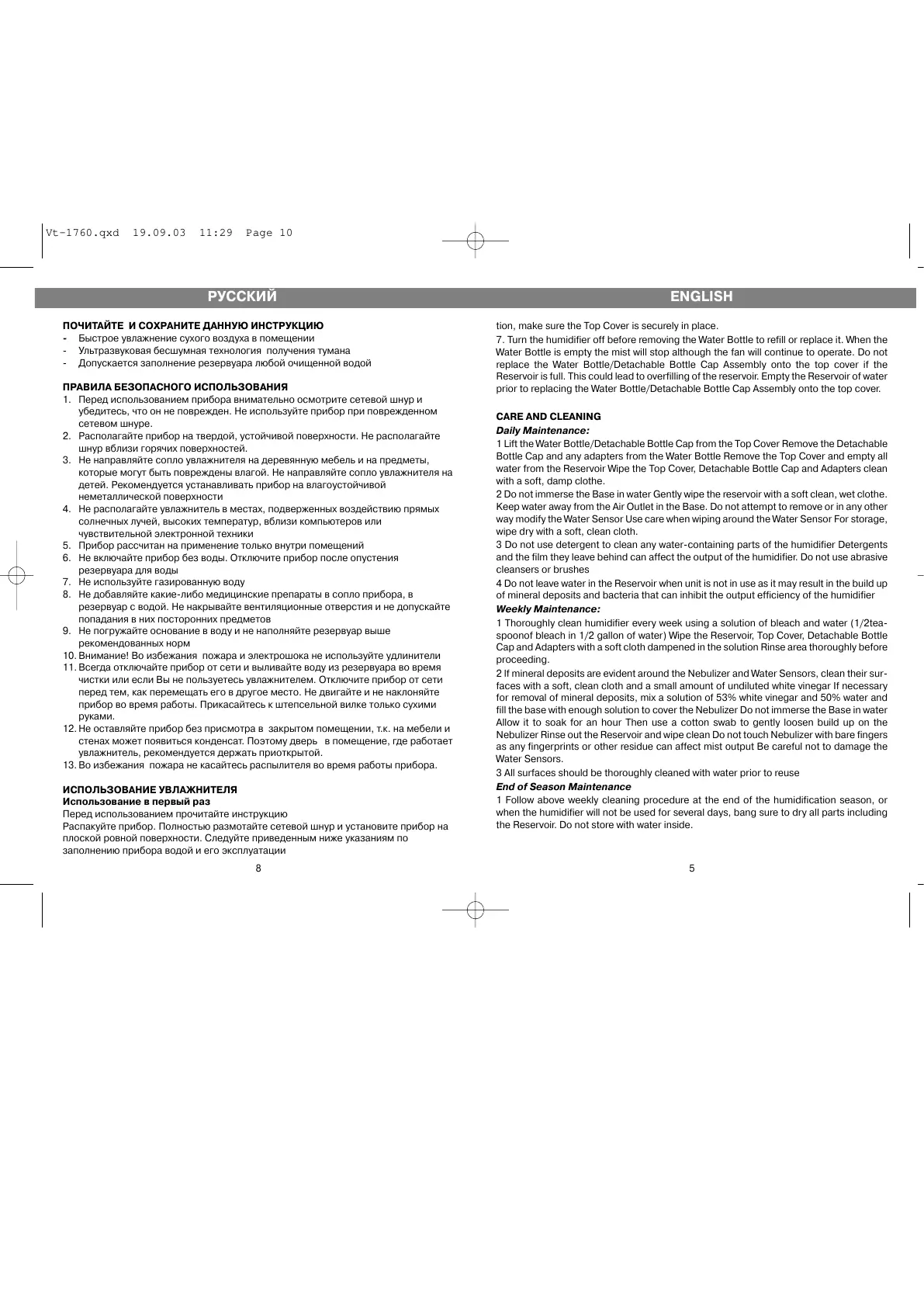 1 Thoroughly clean humidifier every week using a solution of bleach and water (1/2tea