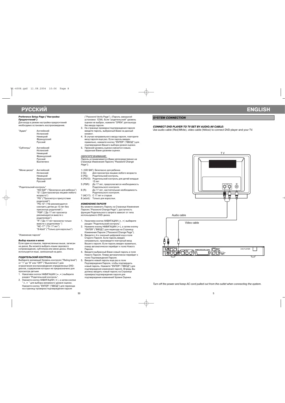 CONNECT DVD PLAYER TO TV SET BY AUDIO/AV CABLE: