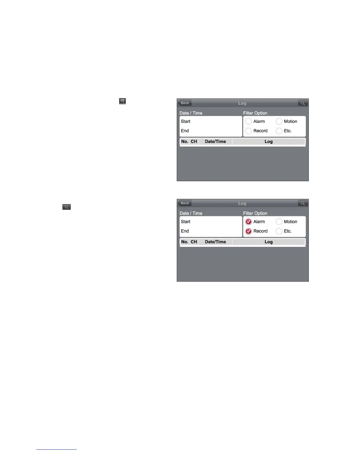 Select one from Alarm, Motion, Record, Etc. and click