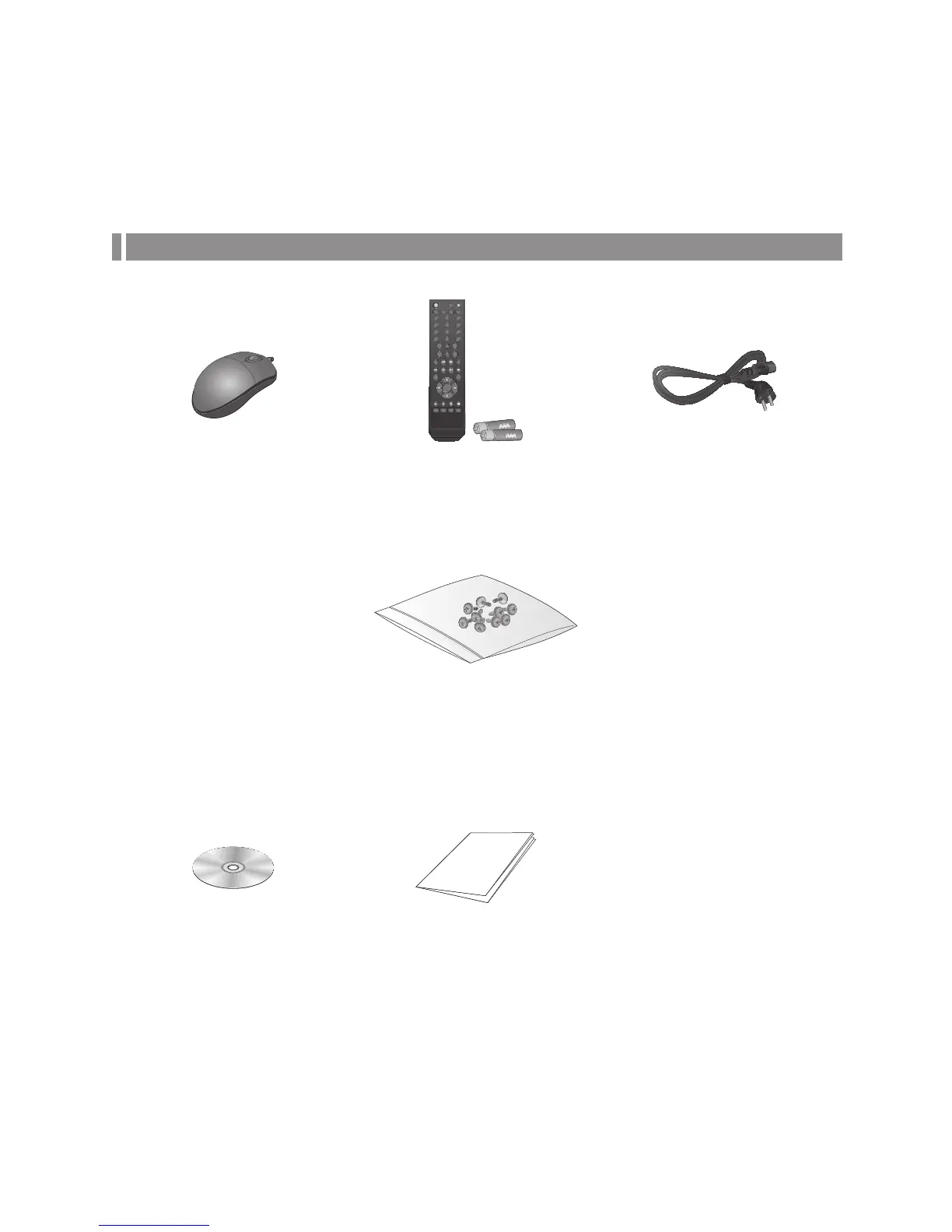 Mouse x1 Remote Control x1 & Batteries (AAA x2) Power Cable x1