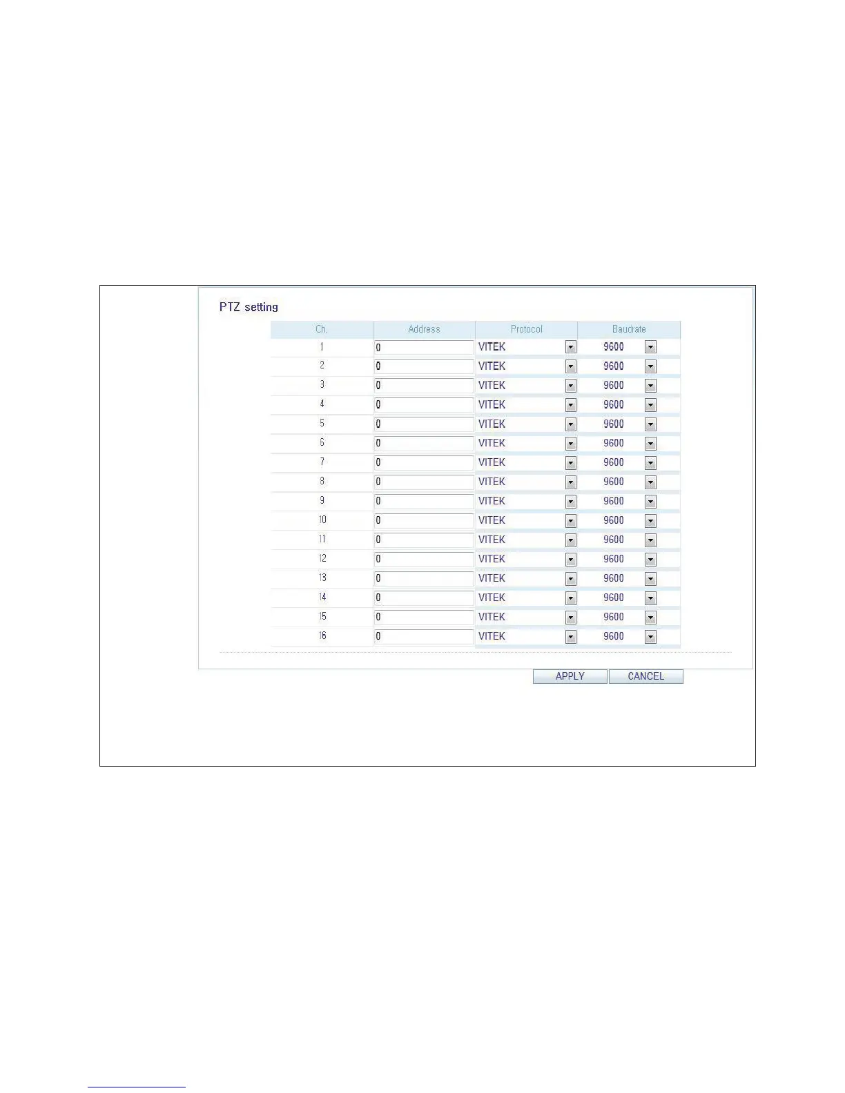To allow the DVR to utilize camera’s PTZ functions, match the address, protocol and baud rate of connected cameras and