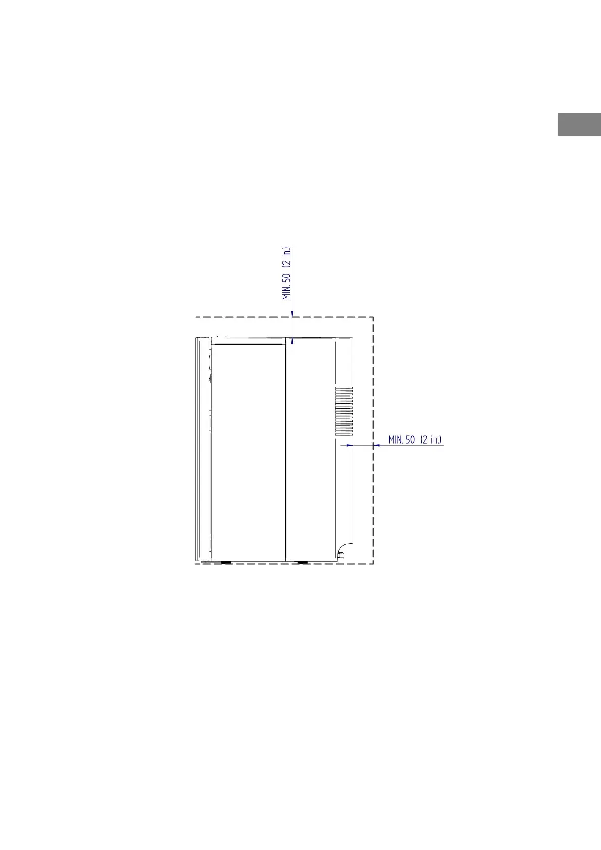 Es wird empfohlen, einen Freiraum von 50 mm (2 in) zwischen der Oberseite des Kühlschranks und