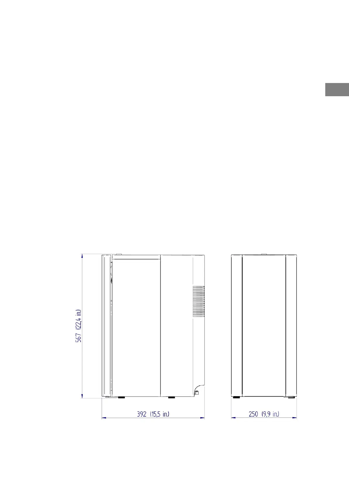 Les dimensions d’encombrement en millimètres (en pouces) du réfrigérateur sont indiquées dans la