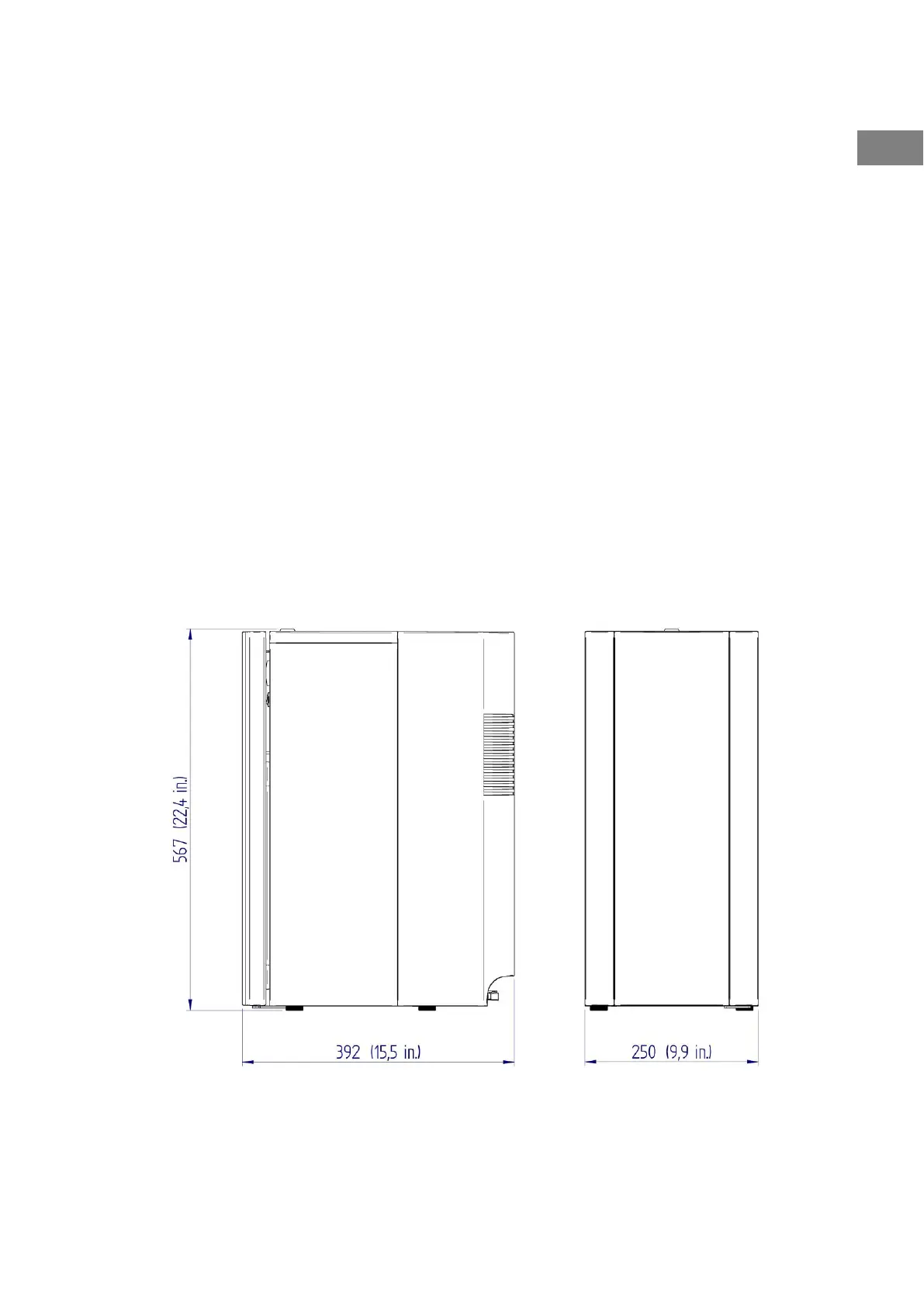 The refrigerator has the overall dimensions in millimetres (in inches) shown in the figure below.