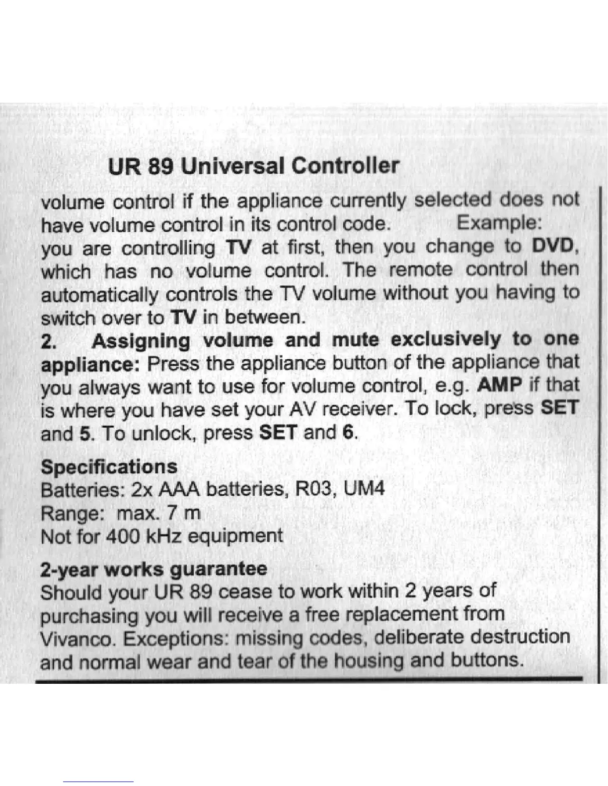 Vivanco UR 89 - Advanced Features and Product Information; Exclusive Volume & Mute Control; Technical Specifications; Warranty Details