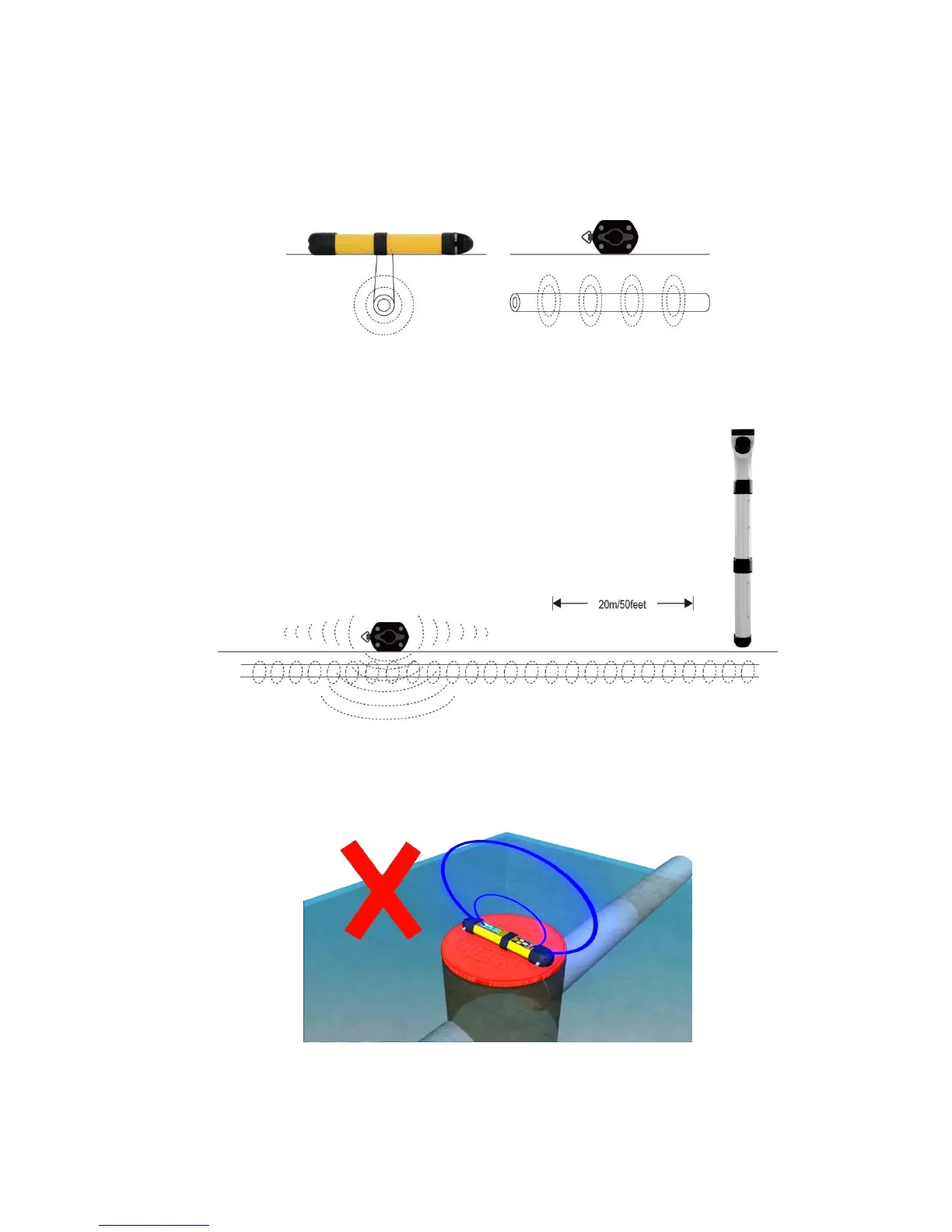 from the transmitter when pinpointing or taking depth readings. Locating closer than 20m is possible but the