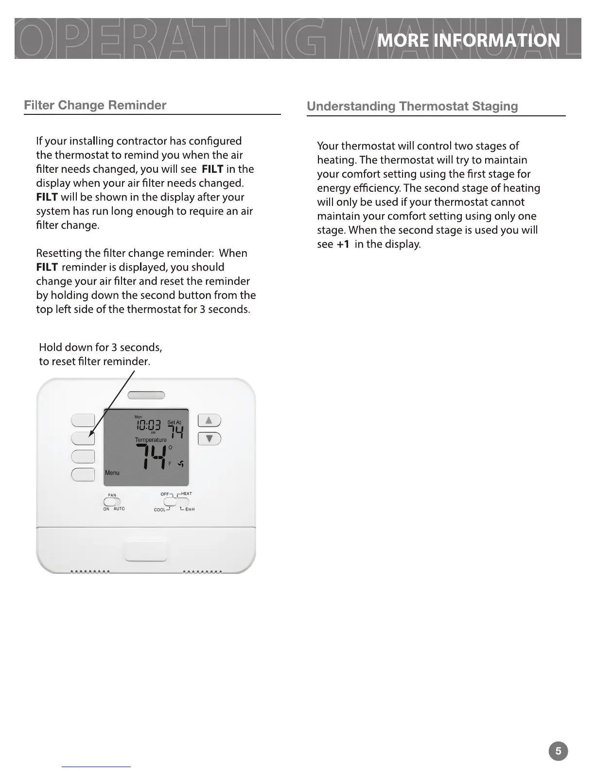 Vive Comfort TP-N-721 - Filter Change Reminder; Understanding Thermostat Staging