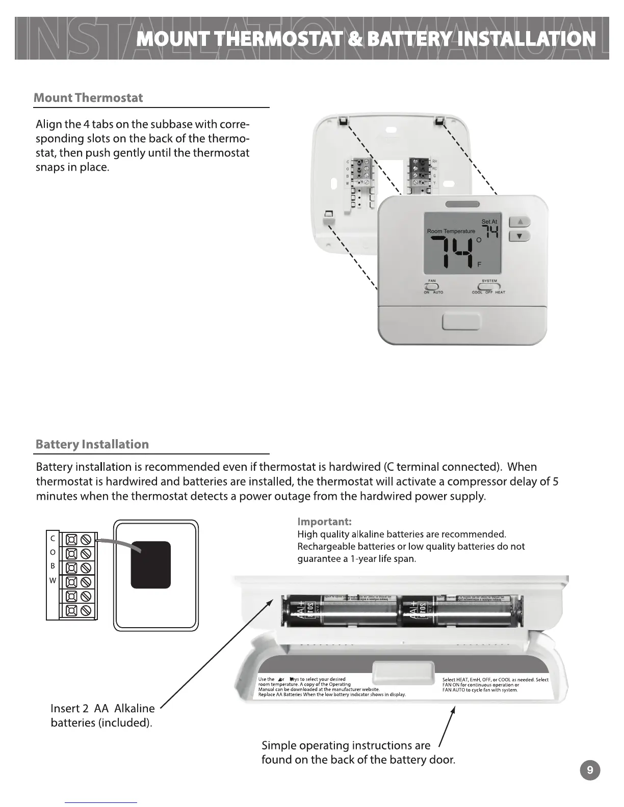 Vive TP-N-701 - Mount Thermostat & Battery Installation; Thermostat Mounting; Battery Installation Guidance