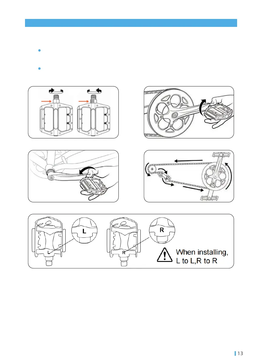 Note: Rotate the pedal marked with “L” into the left crank anticlockwise. Rotate