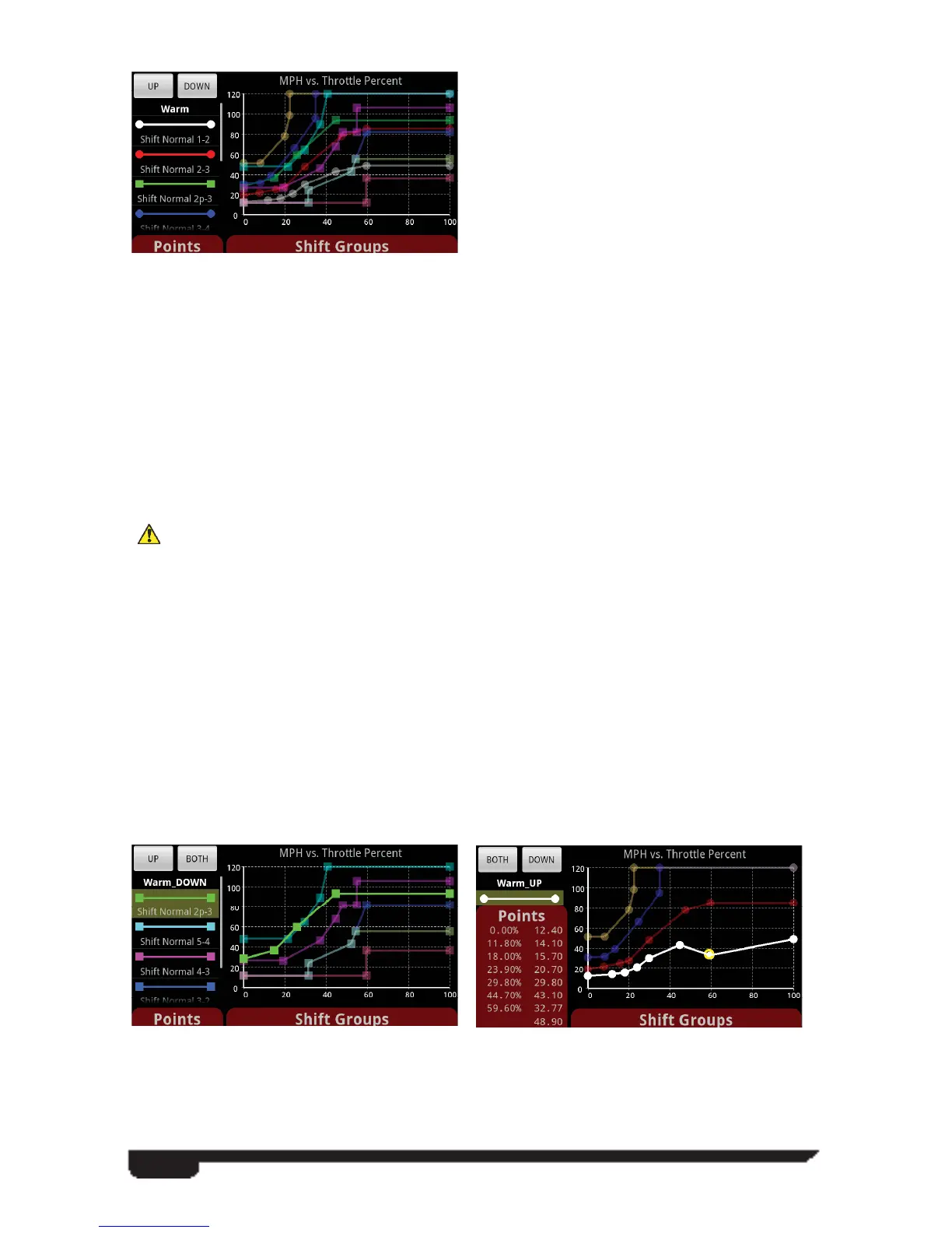 1) The main graph details each shift point line and how it performs by MPH vs.