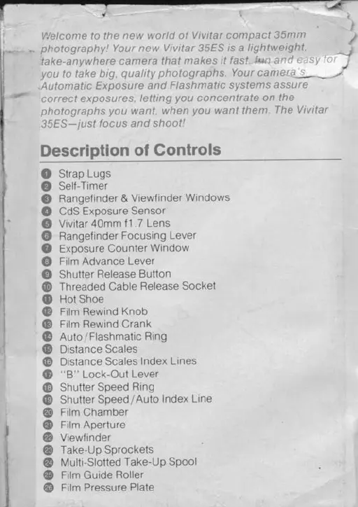 Vivitar 35ES - Description of Controls; Rangefinder & Viewfinder Windows; CdS Exposure Sensor; Vivitar 40 mm f1.7 Lens