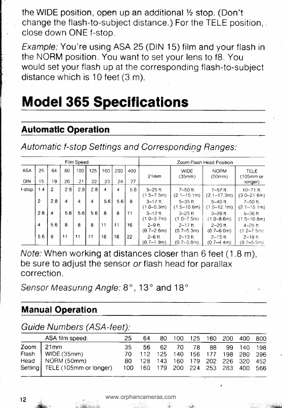 Vivitar 365 - Model 365 Specifications; Automatic Operation; Manual Operation