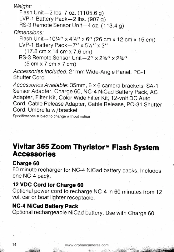 Vivitar 365 - Vivitar 365 Zoom Thyristor Flash System Accessories; Charge 60; 12 VDC Cord for Charge 60; NC-4 NiCad Battery Pack