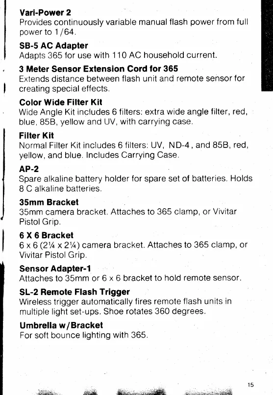 Vivitar 365 - Vari-Power 2; SB-5 AC Adapter; 3 Meter Sensor Extension Cord for 365; Color Wide Filter Kit