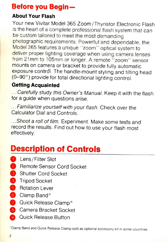 Vivitar 365 - Before You Begin; About Your Flash; Getting Acquainted; Description of Controls