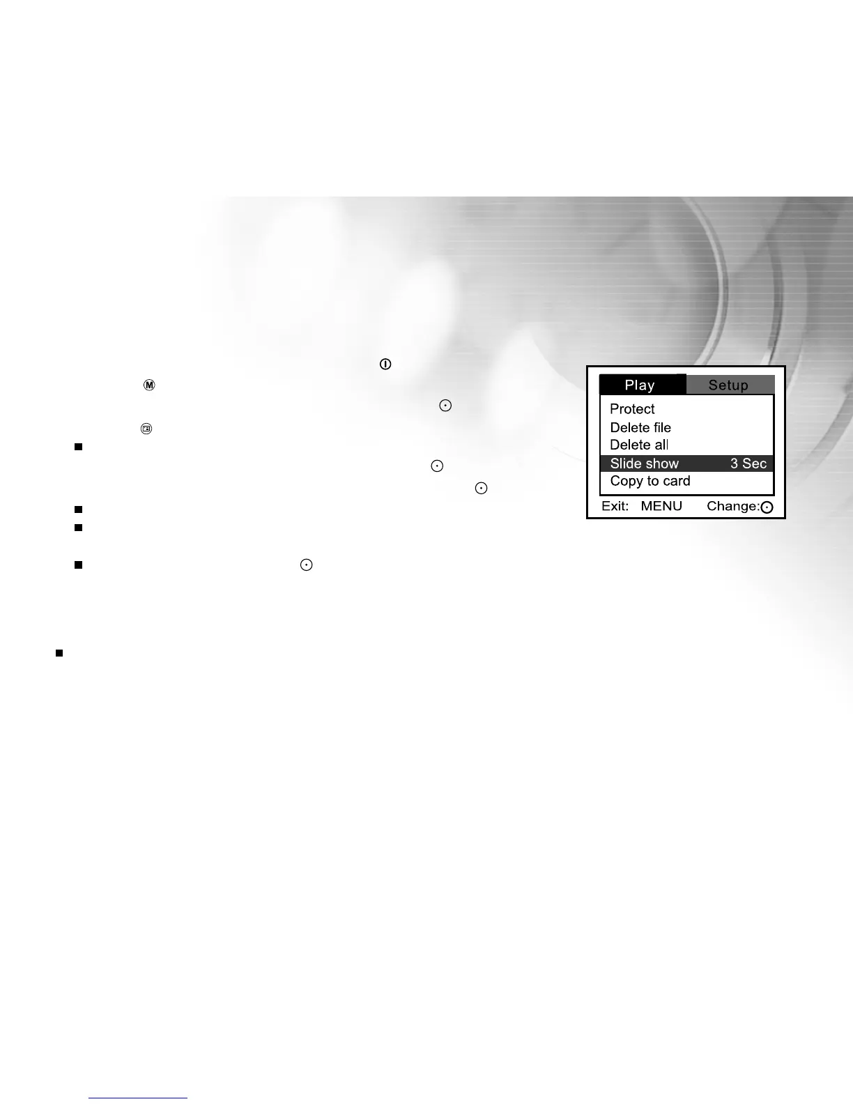 The slideshow function enables you to playback still images/video clips automatically in sequential order.