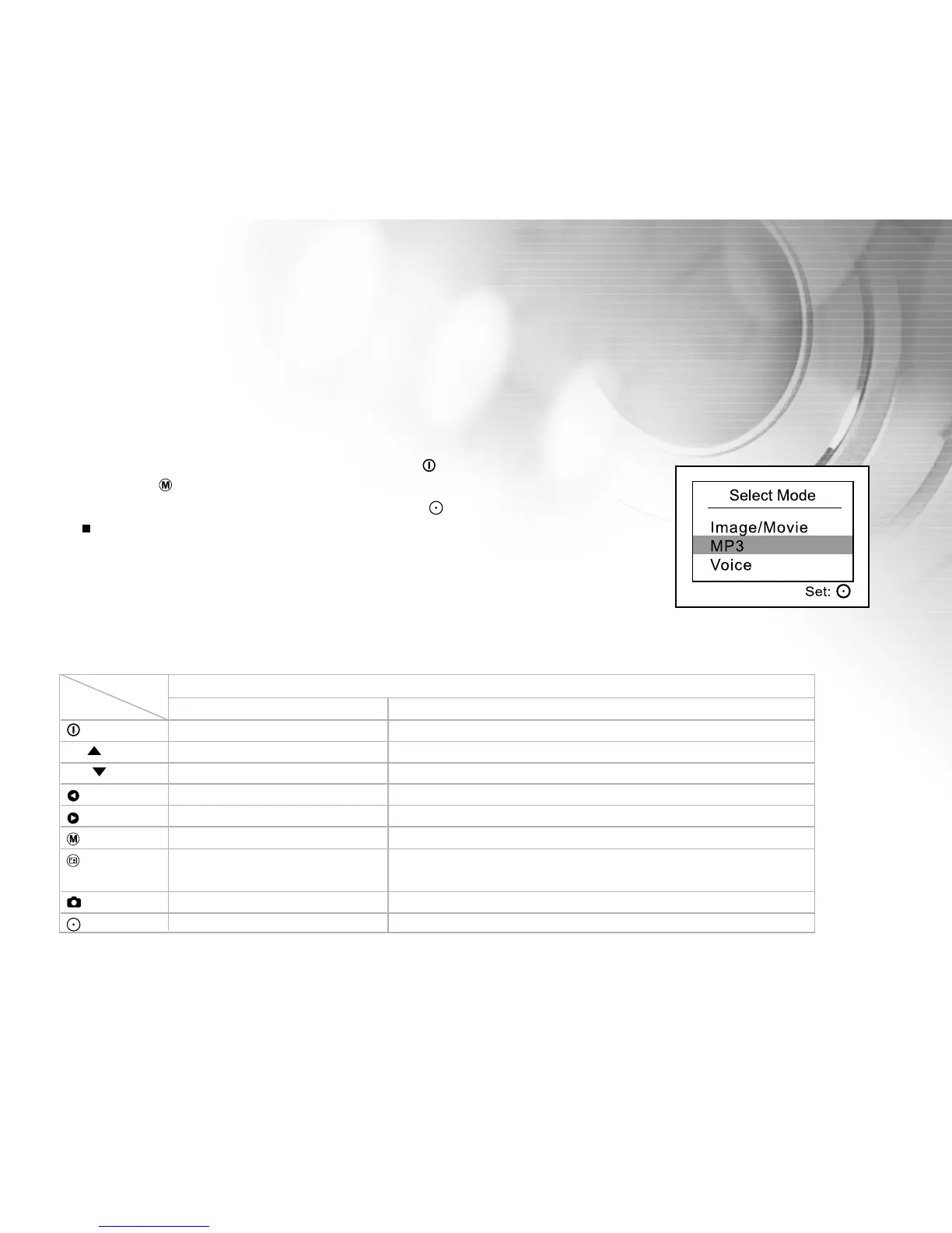 Enter MP3 menu Playing previous or next MP3 music / Fast reverse or