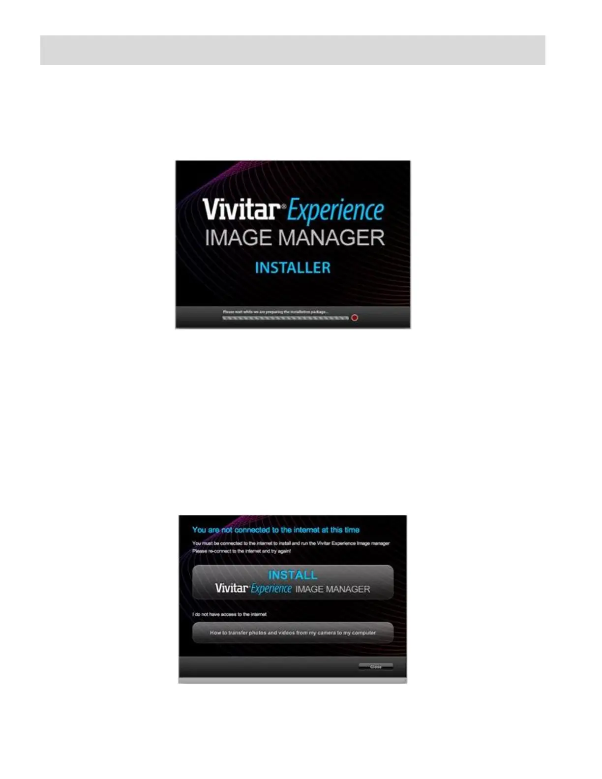 Internet and then click the “Install Vivitar Experience™ Image Manager” button to begin the