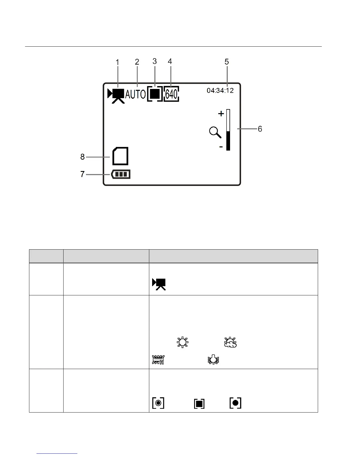 Vivitar DVR 781HD - Video Capture Mode LCD Icon Status Description; Item 1: Mode Selection; Item 2: White Balance; Item 3: Metering