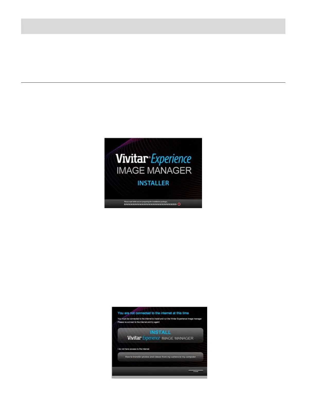You must be connected to the Internet to install and run the Vivitar Experience Image Manager