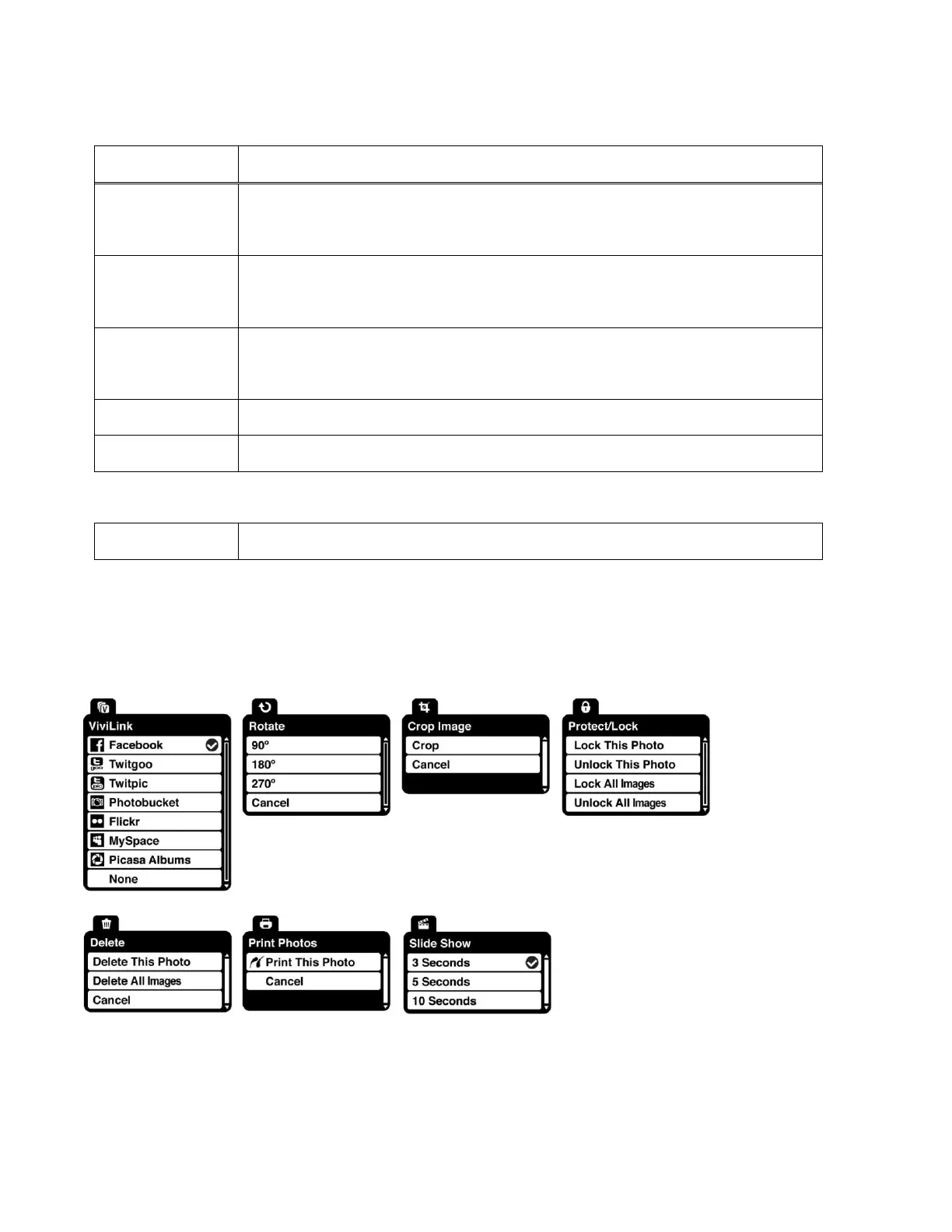 The following menus appear in your digital video camera‟s Photo Playback Mode: