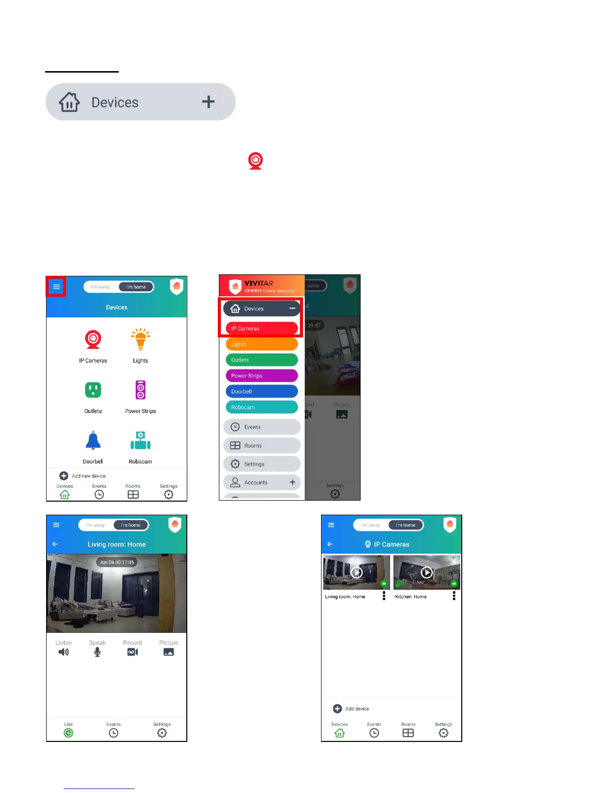 From the ‘Devices’ Home screen, tap IP Cameras to: