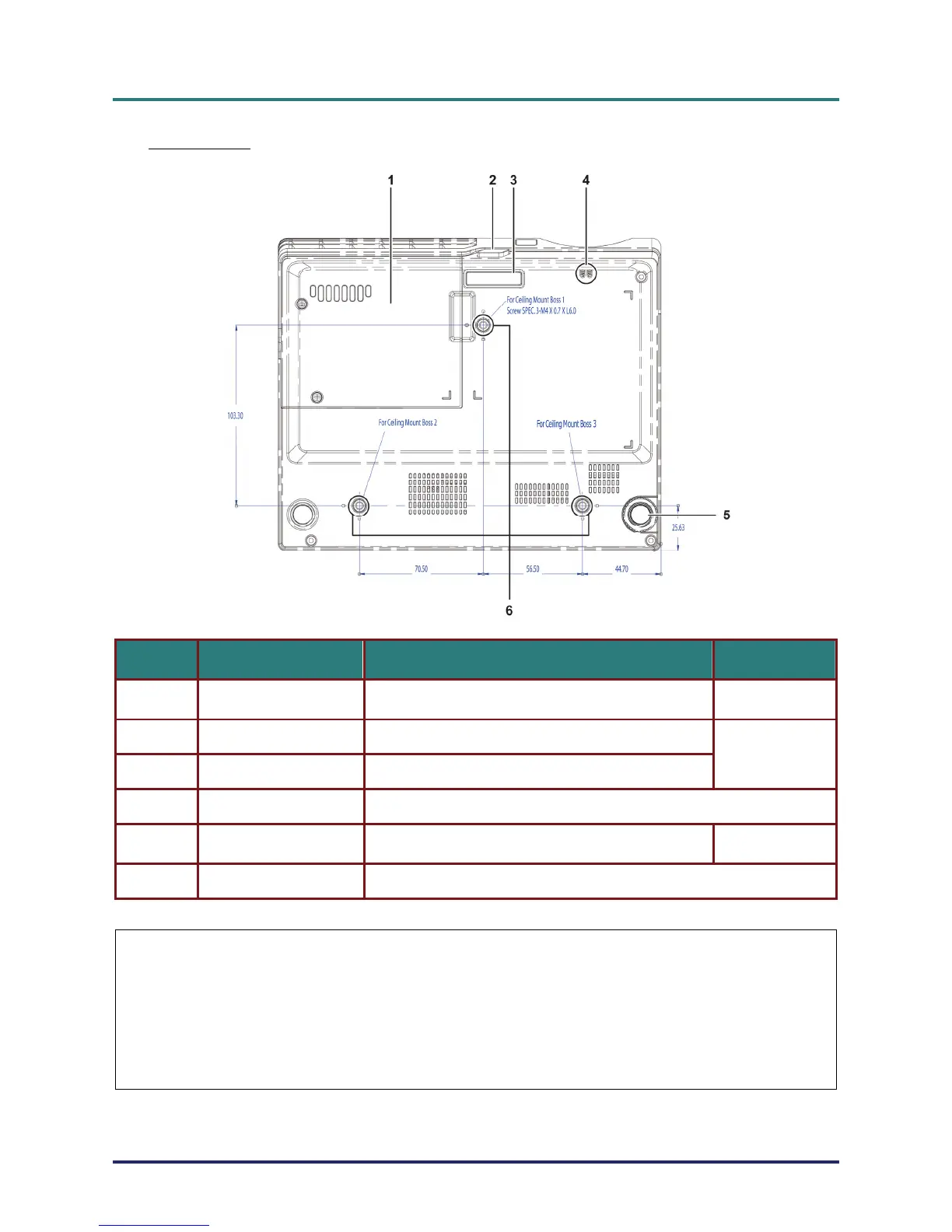 Ceiling support holes Contact your dealer for information on mounting the projector on a ceiling.