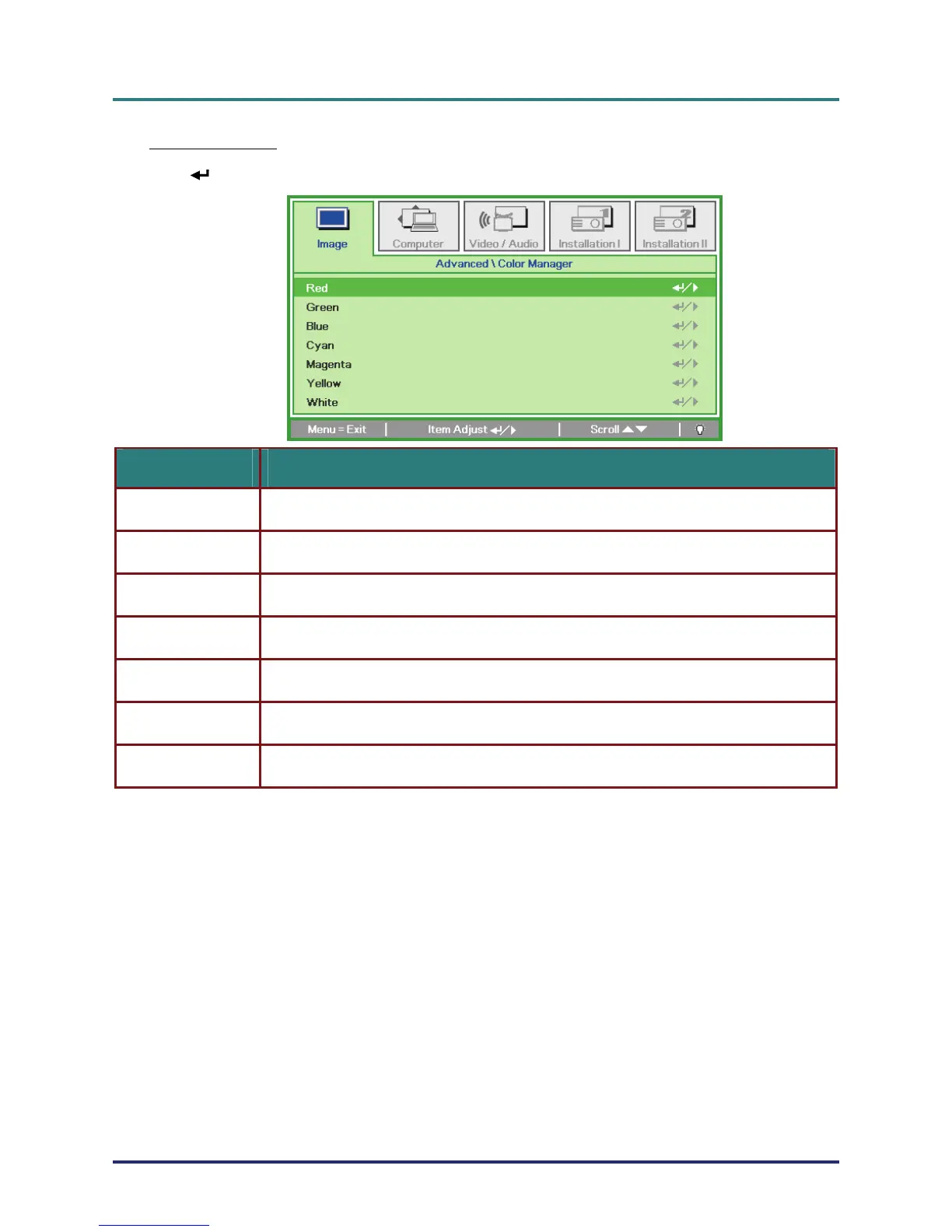 (Enter) / ► to enter the Color Manager sub menu.