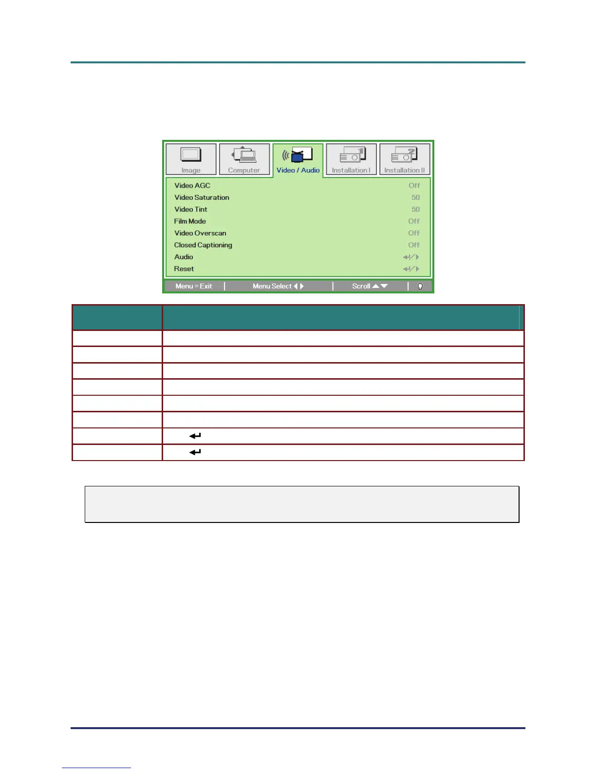 Video/Audio menu. Press the cursor ▲▼ button to move up and down in the Video/Audio menu.
