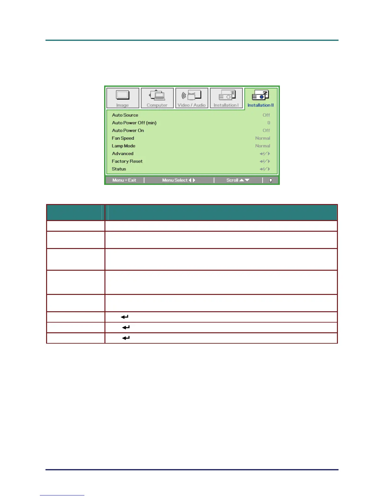 tion II menu. Press the cursor ▲▼ button to move up and down in the Installation II menu.