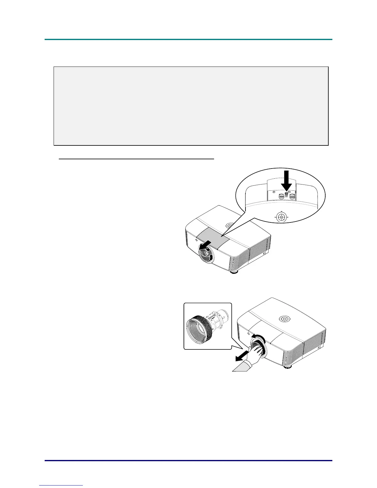 Before removing or installing the lens, be sure to turn off the projector, wait until the cooling fans