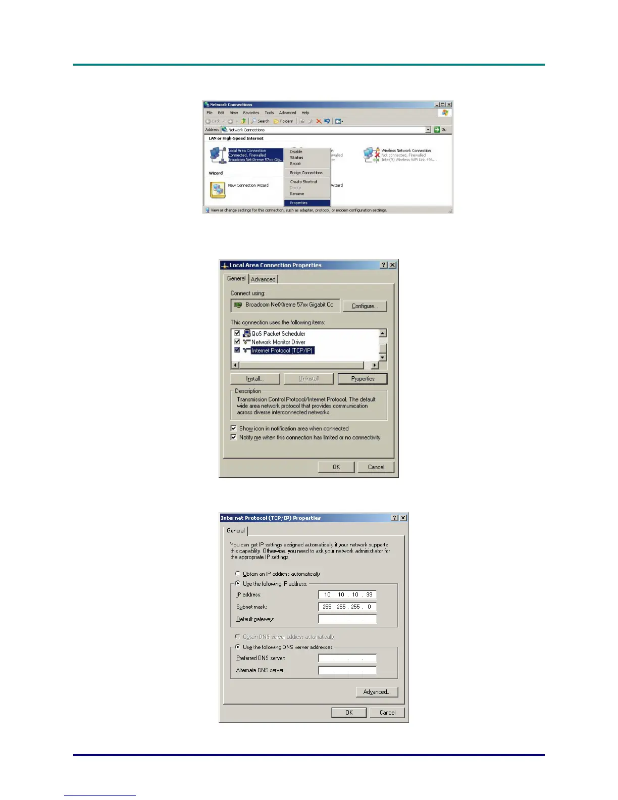 6. Click Use the following IP address and fill in the IP address and Subnet mask, then click OK.