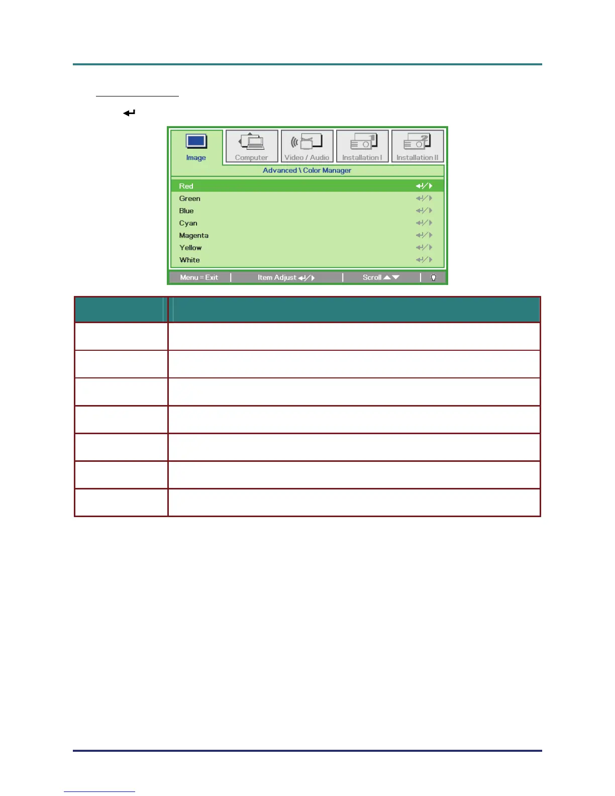 Press (Enter) / ► to enter the Color Manager sub menu.