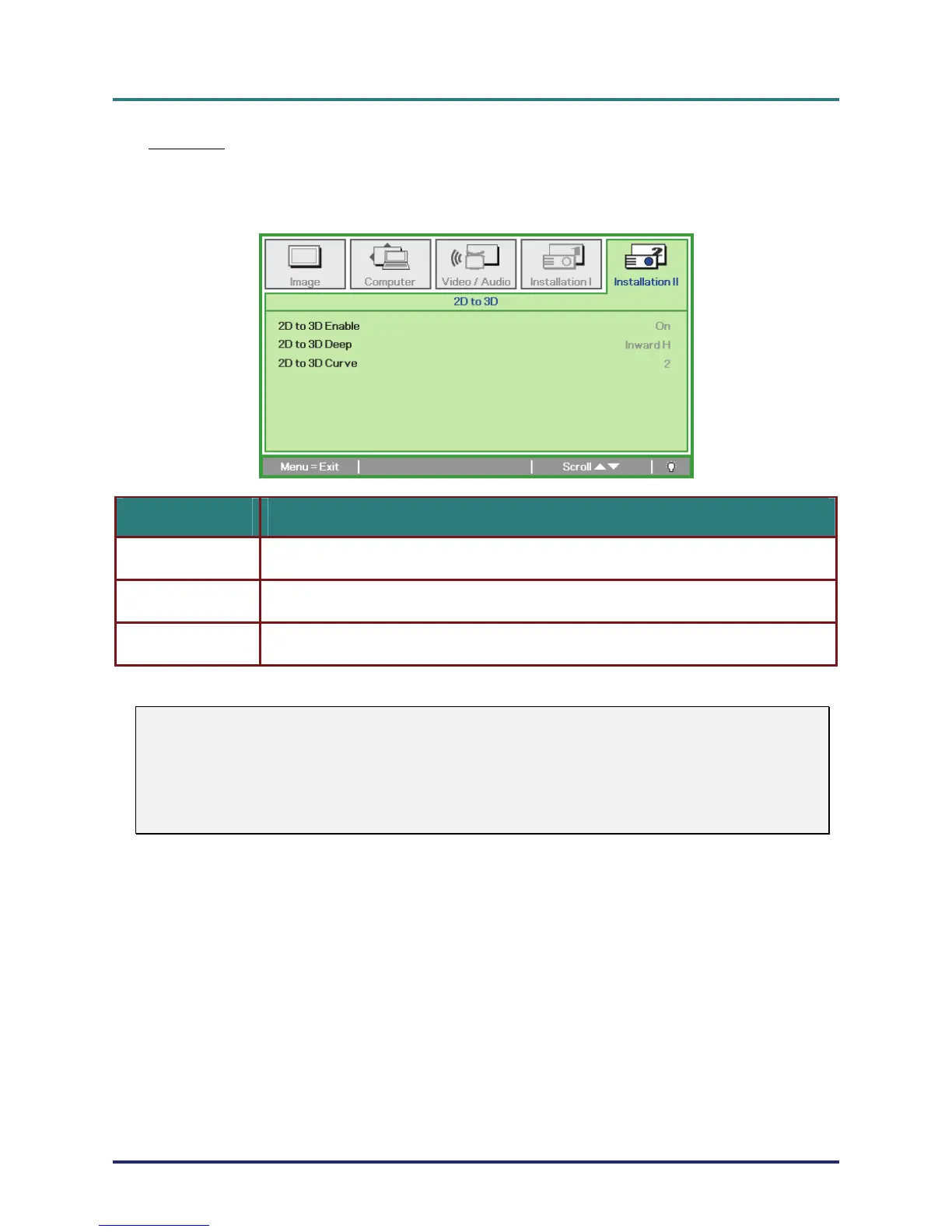 Press ▲▼ to move to the 2D to 3D menu and then press Enter or ►. Press ▲▼ to move up and