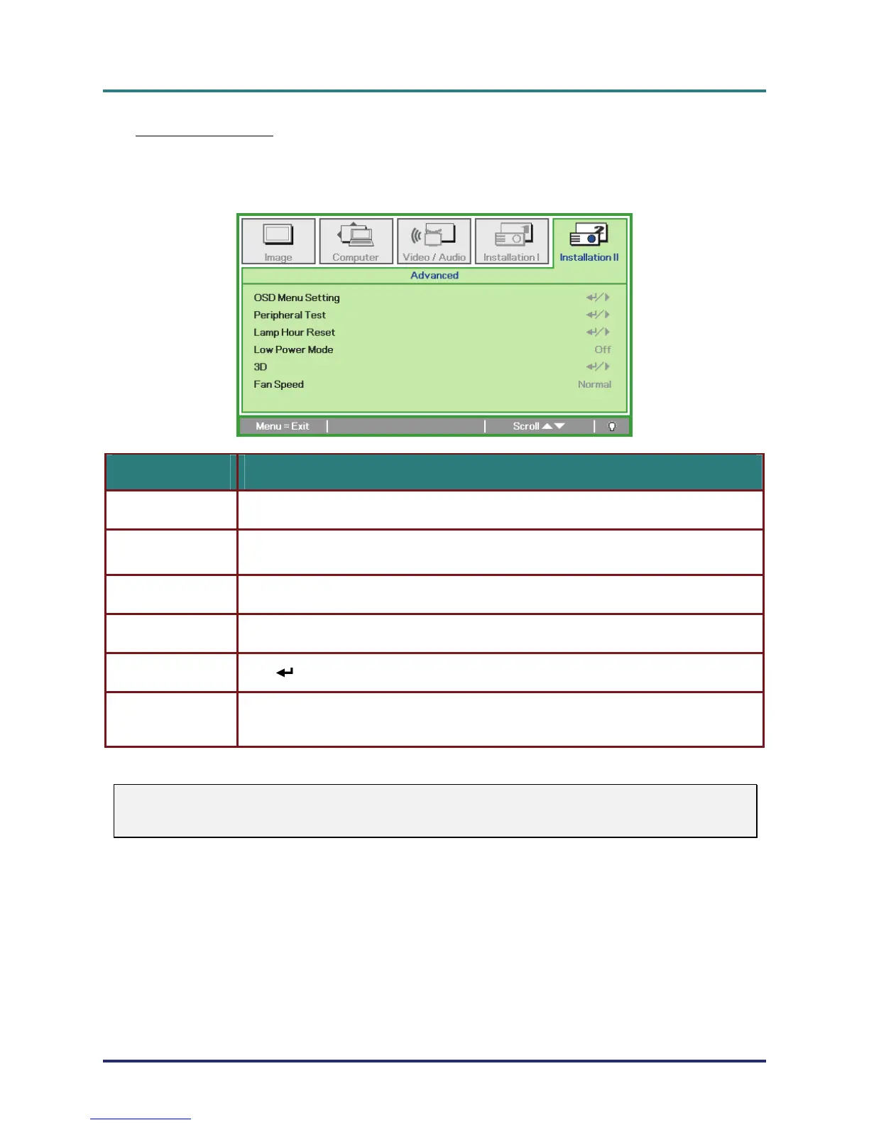 Press the Menu button to open the OSD menu. Press ◄► to move to the Installation II menu.