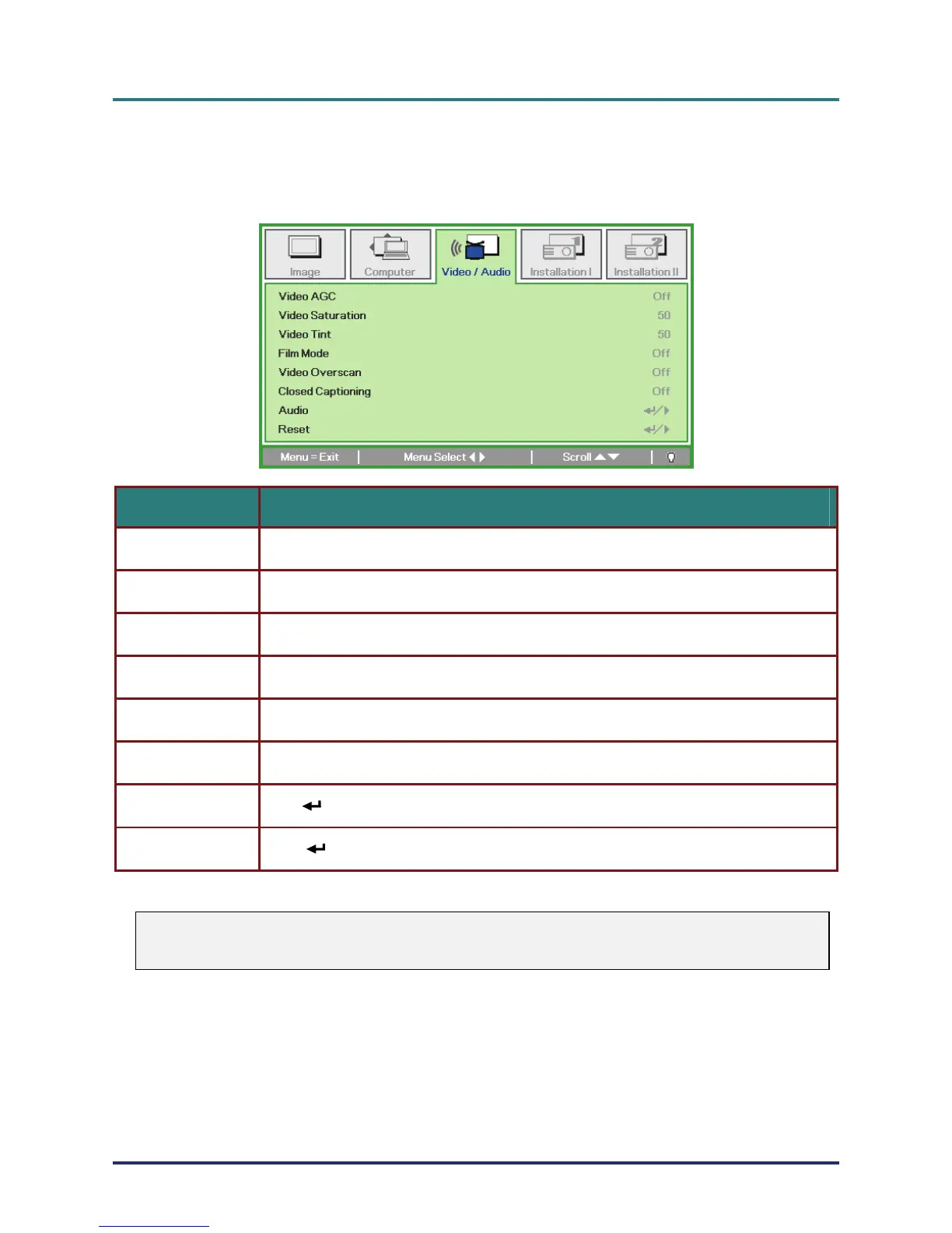 Video Overscan Press the ◄► buttons to enable or disable video over scan.