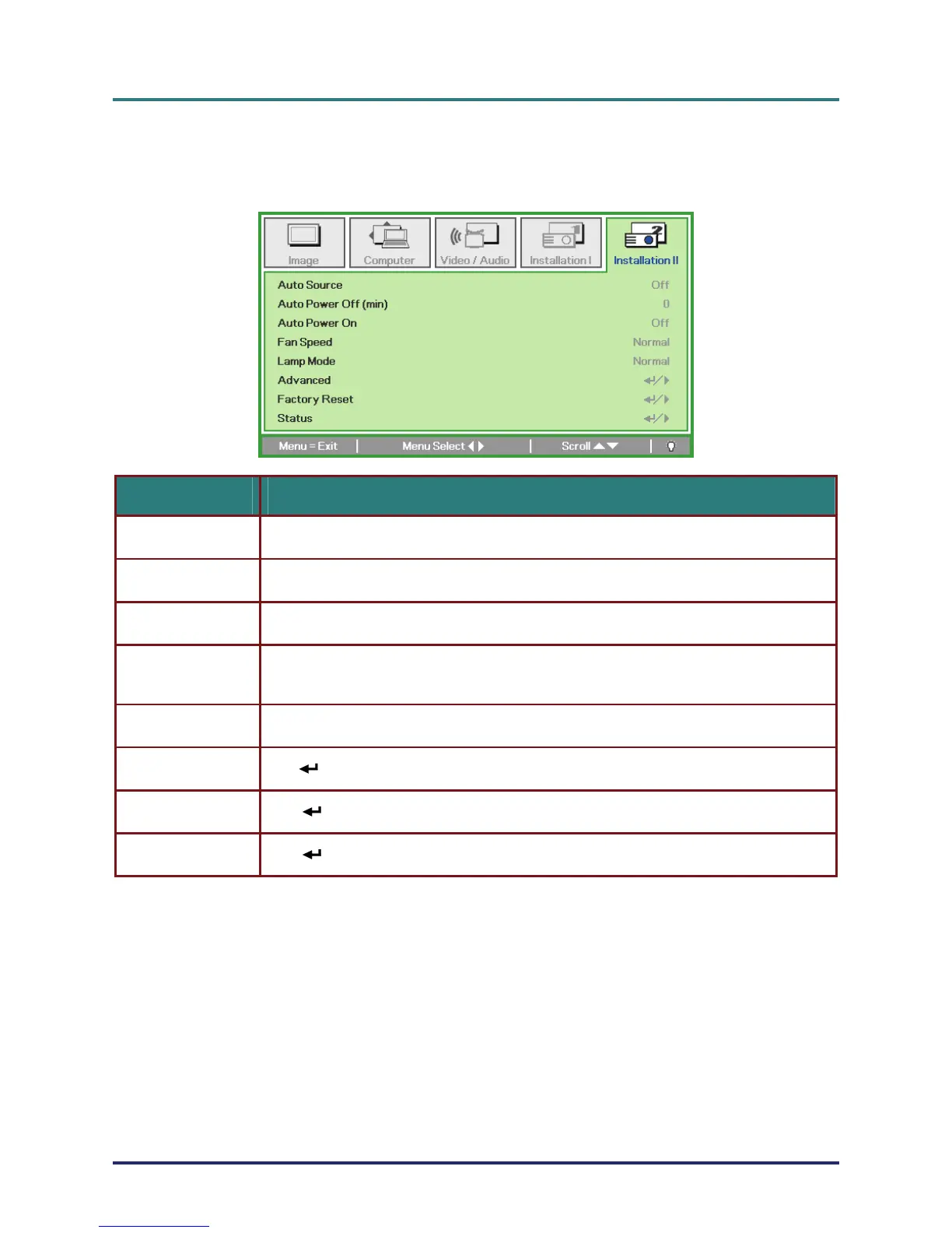 tion II menu. Press the cursor ▲▼ button to move up and down in the Installation II menu.