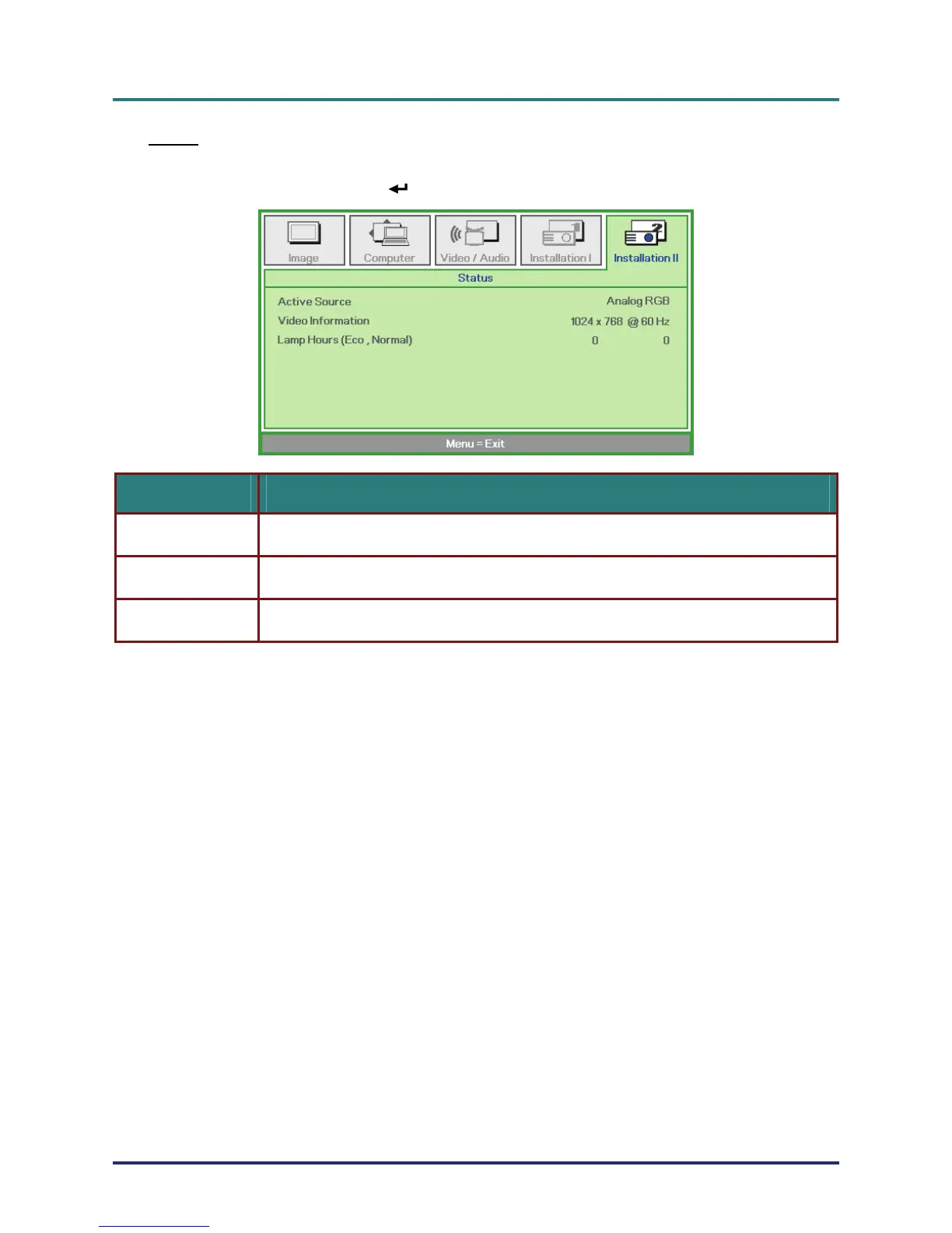 Lamp Hours Lamp hour used information is displayed. Eco and Normal counters are separated.