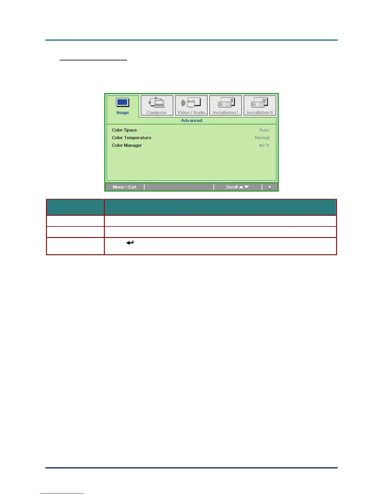 (Enter) / to enter the color manager menu. See page 23 for more infor-