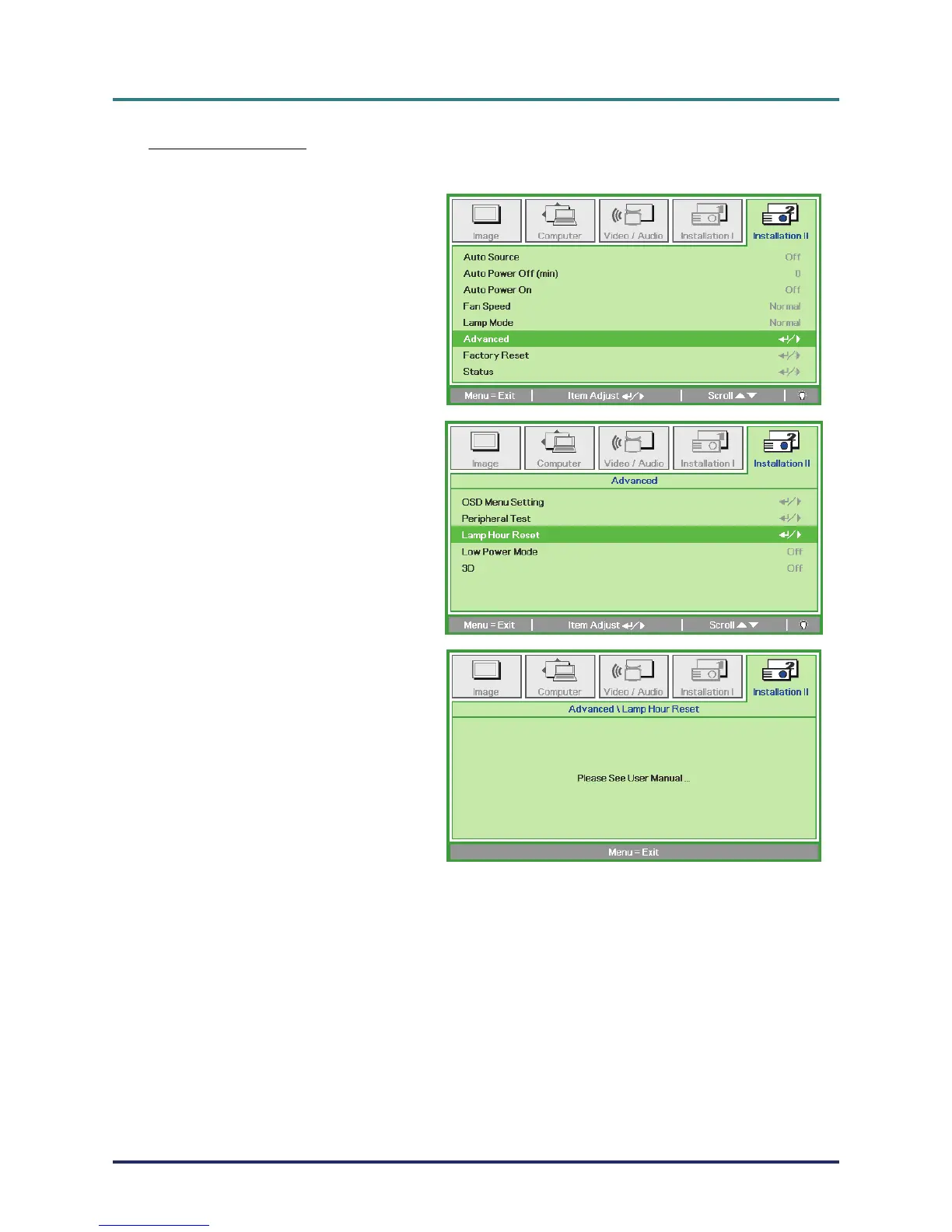 After replacing the lamp, you should reset the lamp hour counter to zero. Refer to the following: