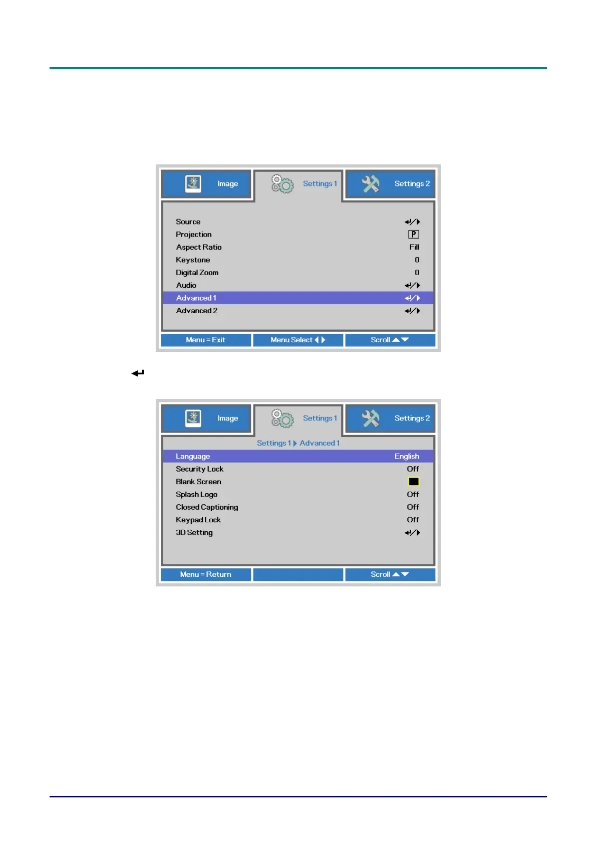 1. Press the MENU button. Press the cursor ◄► button to navigate to Settings 1. Press the cursor