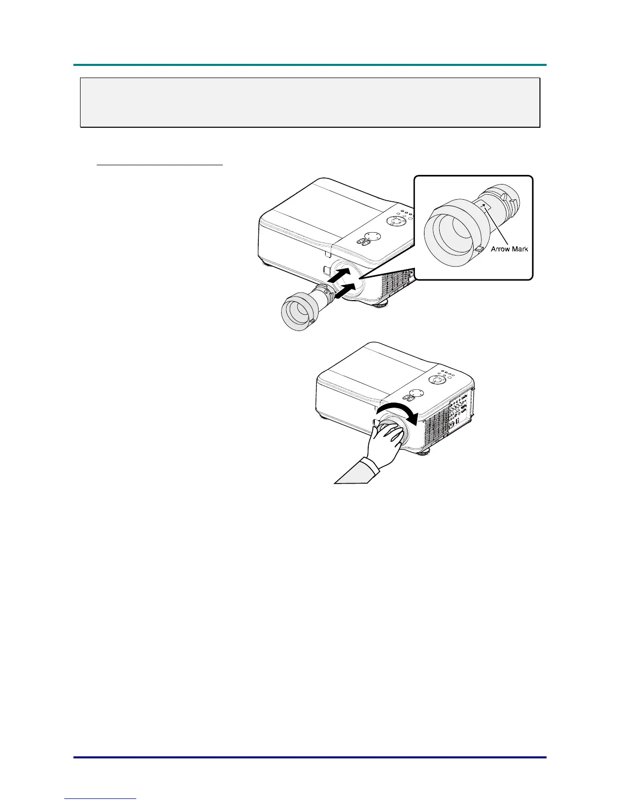tional lens before installing the optional lens into the projector. Failure to do so will cause damage to