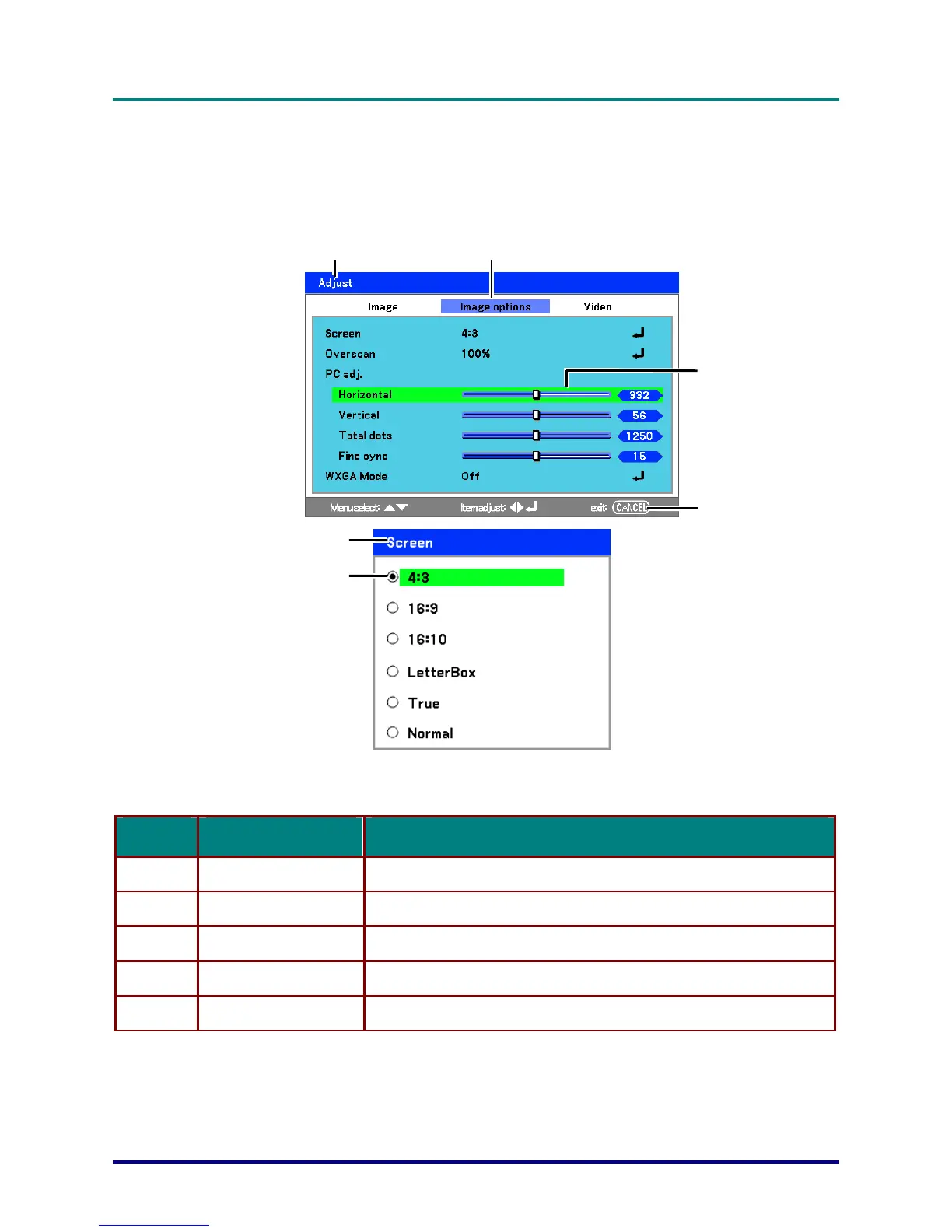 Exit Return to the previous menu.