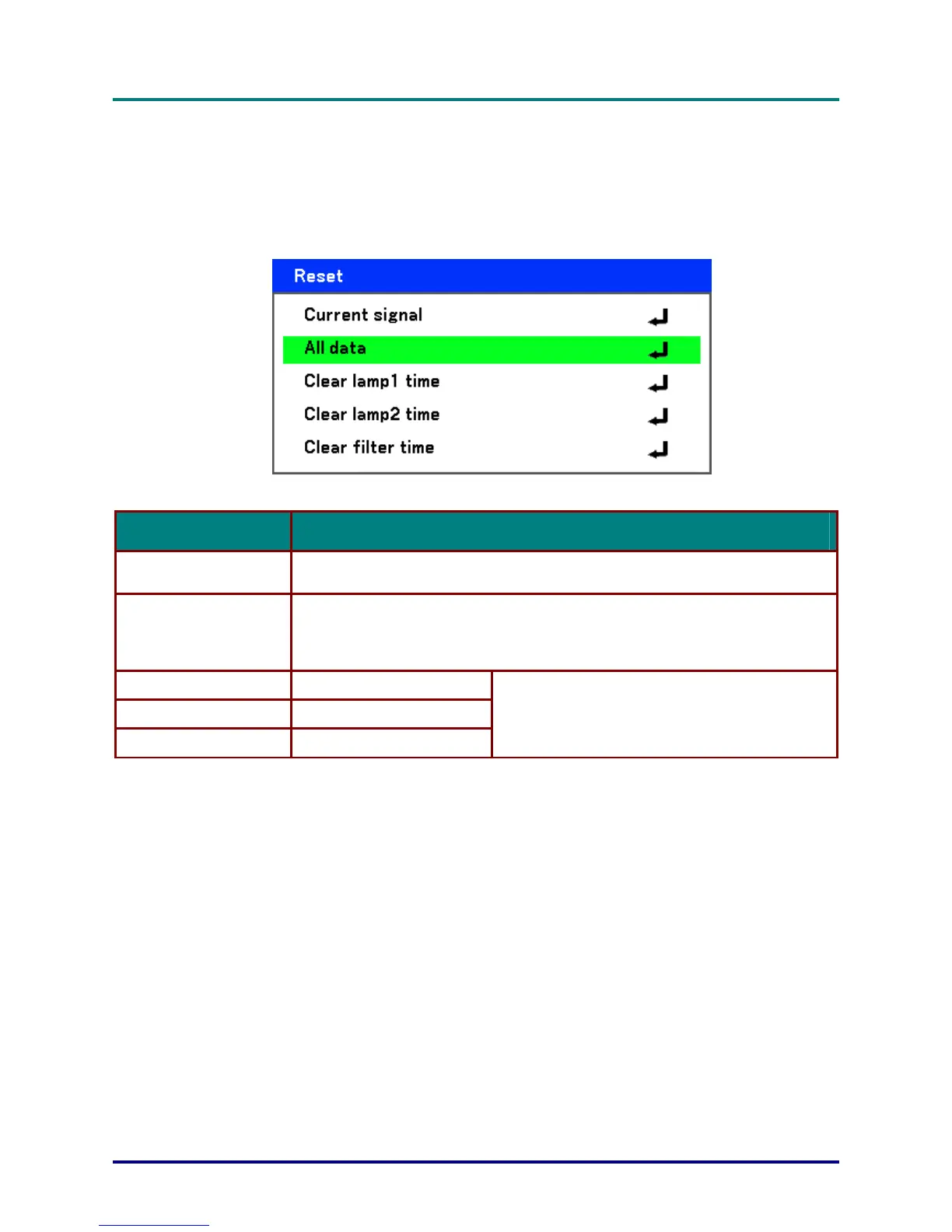The Reset menu contains options for returning settings to the factory default and is accessed by us-
