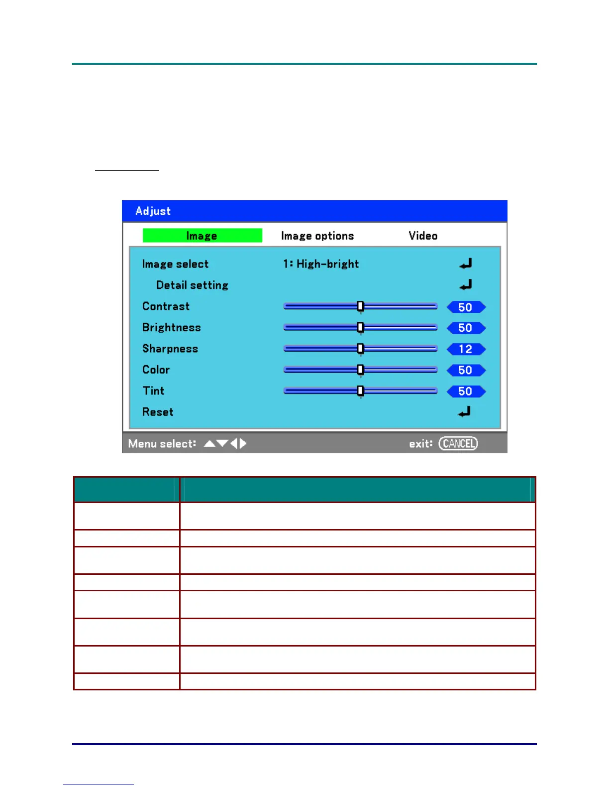 The Adjust menu contains overall projector settings for image output such as sharpness, overscan