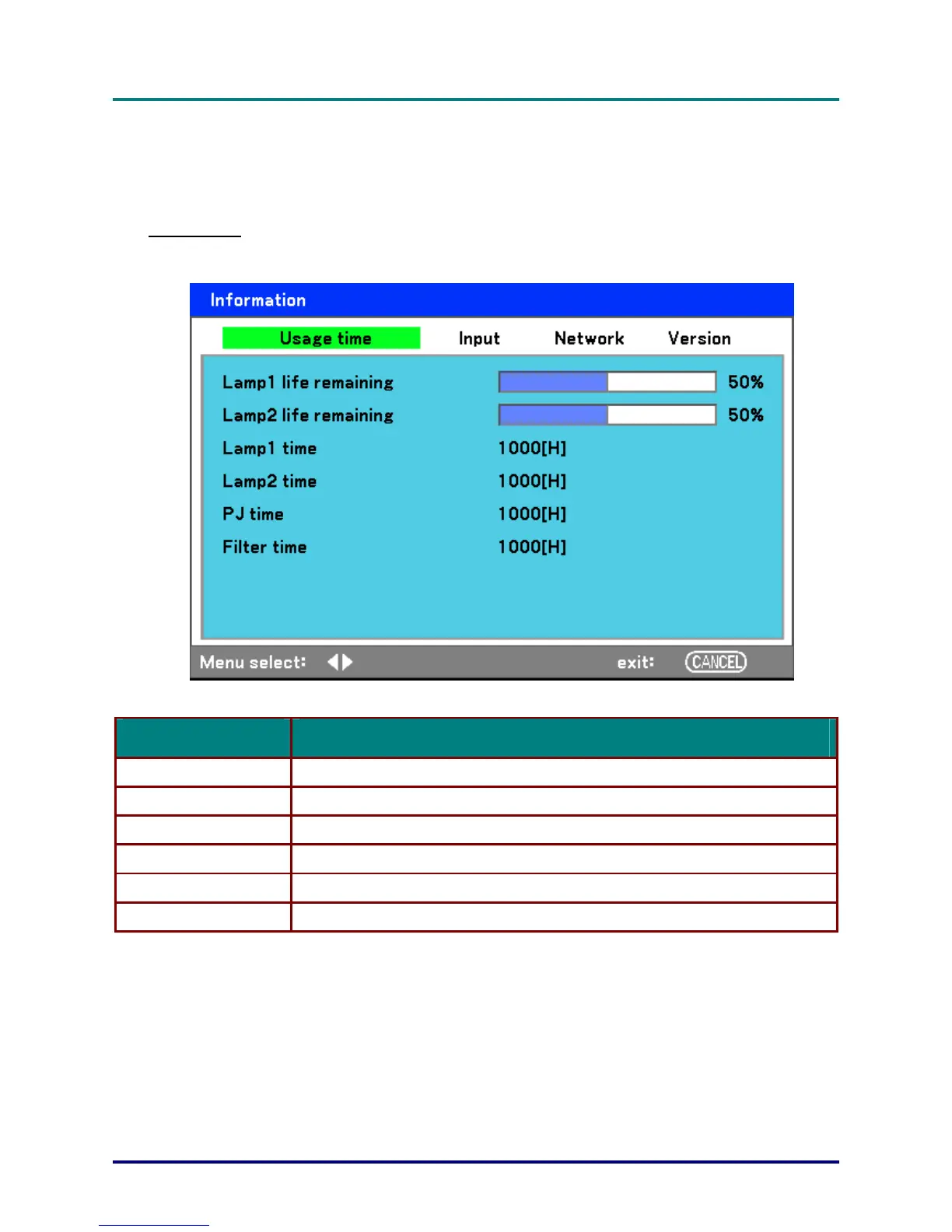 The Usage time tab displays information about lamp usage and remaining lamp life.